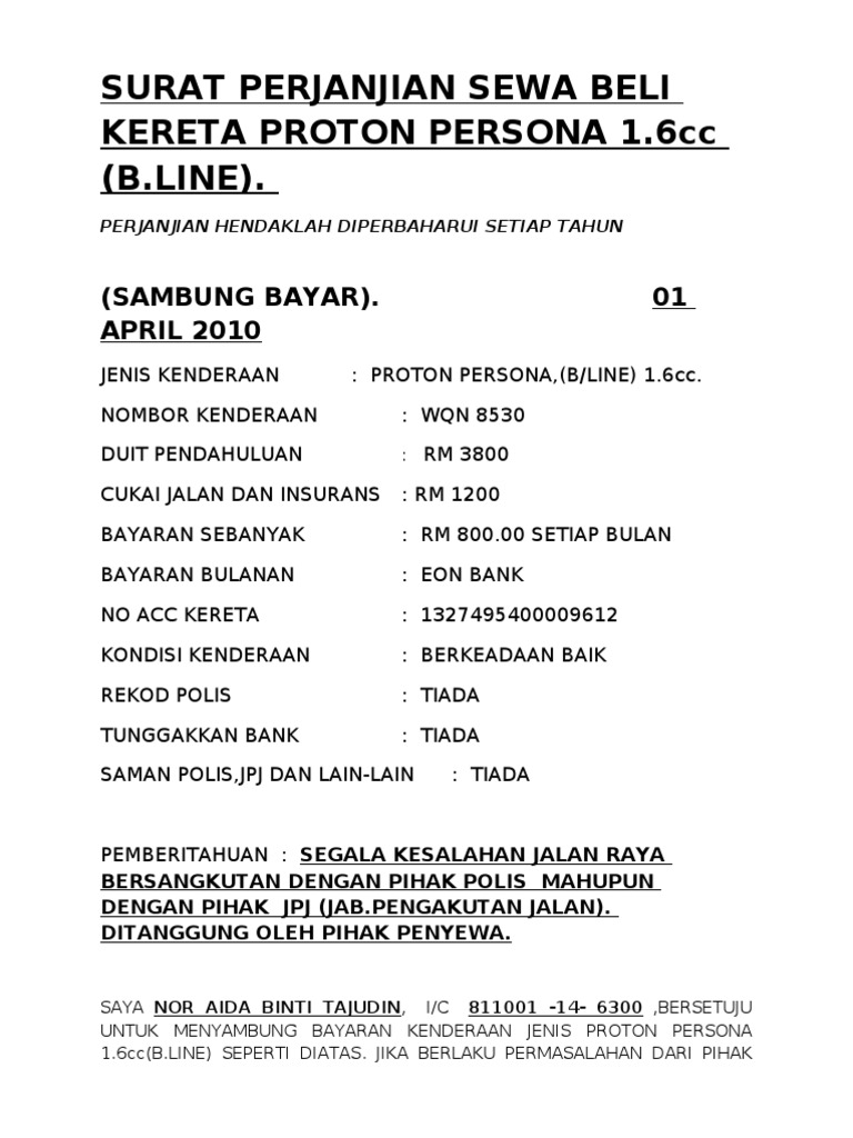 Surat Perjanjian Sewa Beli Kereta Proton Persona Pdf